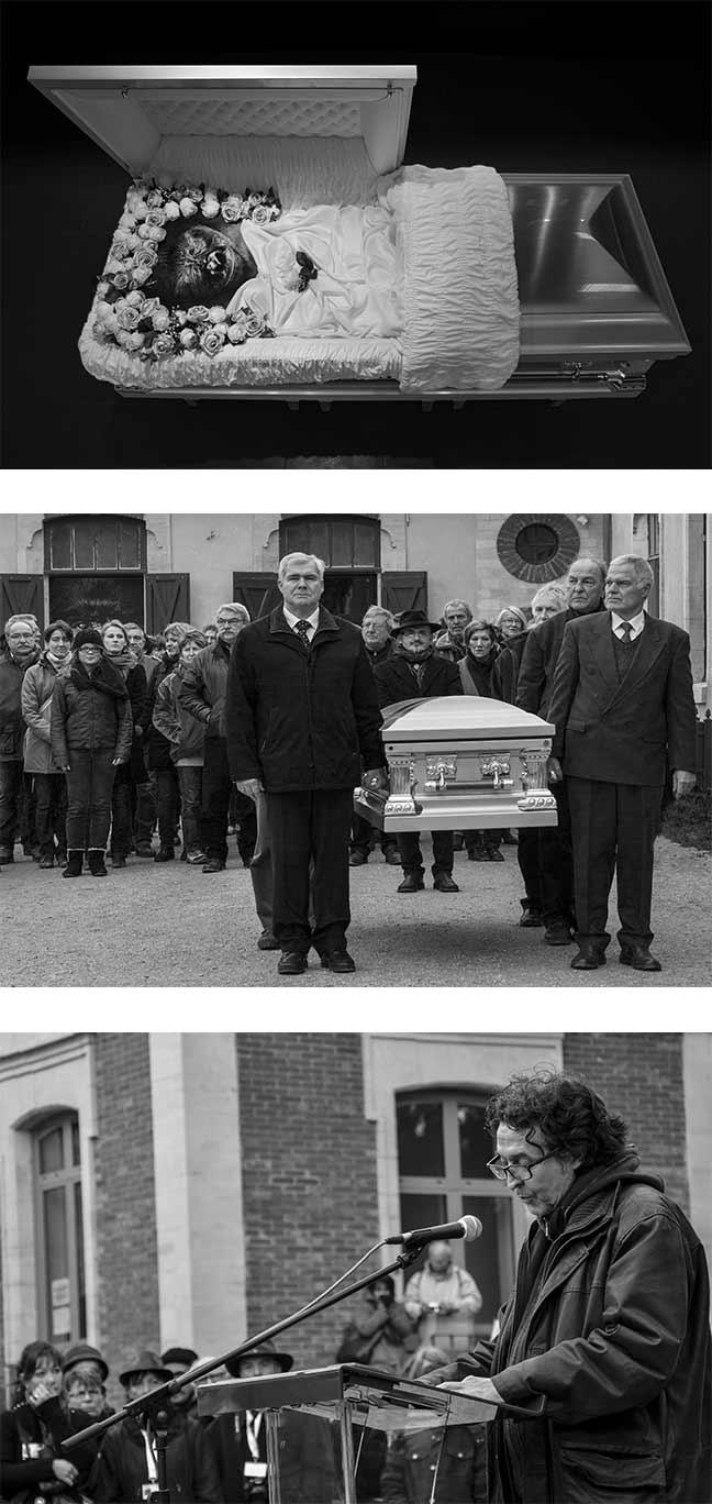 Un imposant cercueil américain de couleur argenté trône au milieu du funérarium. À l’intérieur repose la dépouille de Kolinga. Sur les murs, Gilles Martin présente une exposition de 60 tirages noir & blanc.